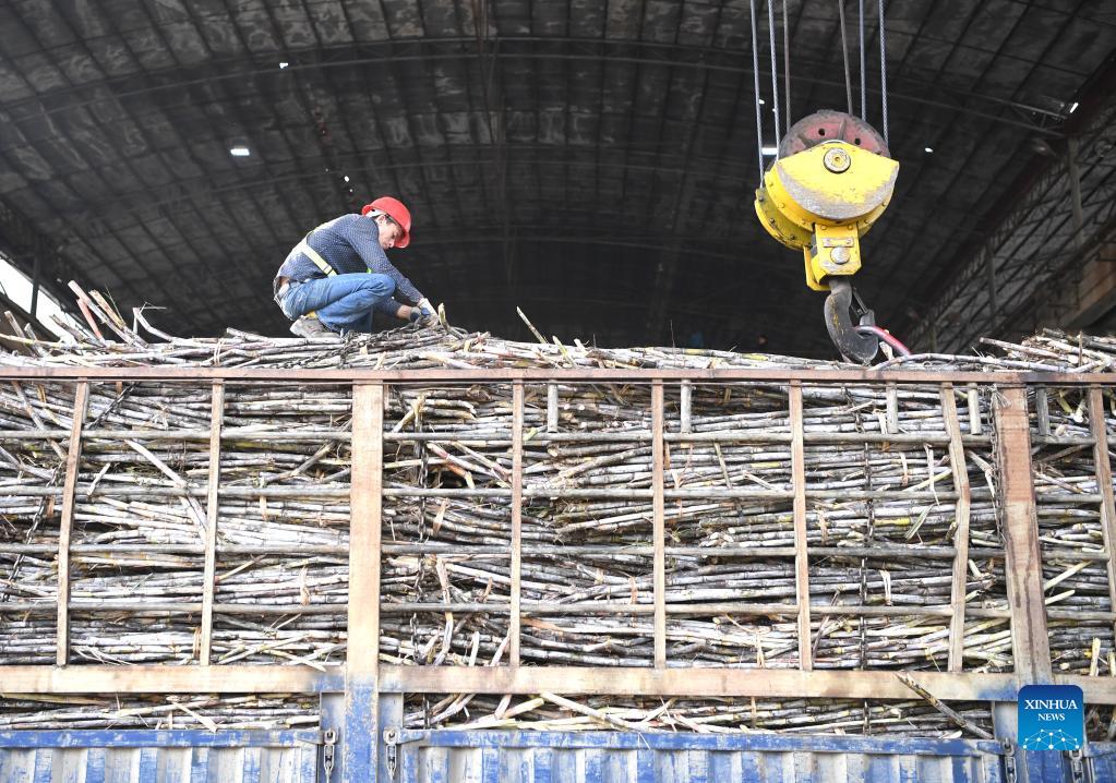 A worker unloads sugarcanes at a sugar factory in Longzhou County, Chongzuo City of south China's Guangxi Zhuang Autonomous Region, Dec. 15, 2021. According to sugar industry development office of Guangxi, 66 sugar factories, nearly 90 percent of the 74 sugar factories scheduled to open this season, have started to produce sugar as of Dec. 15. (Xinhua/Zhou Hua)