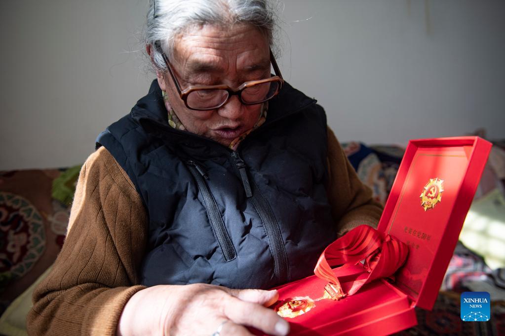 Tsering Drolma displays her commemorative medal awarded to those who have been members of Communist Party of China for five decades in Lhasa, southwest China's Tibet Autonomous Region, Dec. 7, 2021. Tsering Drolma, born in 1940, is a retiree living in urban area of Lhasa. She was once a serf and led a miserable life in childhood. At the age of 8, she was too young to do heavy work, thus she could earn few rations from the serf owner. Apart from starvation, she had to endure the coldness as her serf owner made her sleep outdoors with livestock at night. "What a felicity it was to bathe in the sunshine a little earlier everyday. The sun is unbiased to bring its warmness to everyone," Tsering said. After the democratic reform in Tibet in 1959, Tsering's life has been greatly changed. "Starvation and coldness have gone away from my life. I have three children. Two of them have received college education," said Tsering happily. Now her retirement pension ensures her stable life. Tsering has donated money to local elderly people and people with disabilities for several times. "As my sufferings had come to an end, I've tried to offer my helping hands to those in need," she said. (Xinhua/Sun Ruibo)