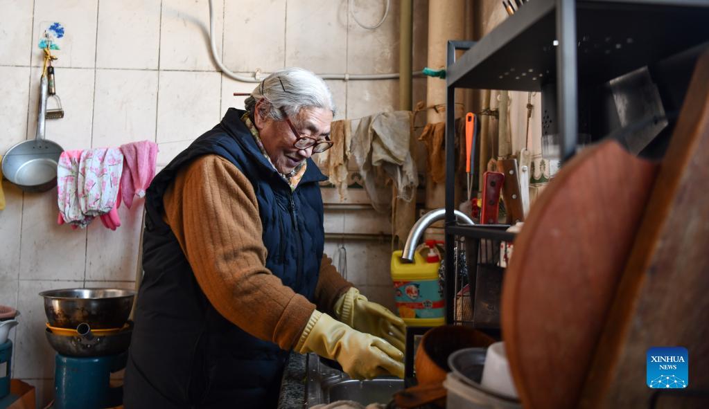 Tsering Drolma prepares for lunch at her house in Lhasa, southwest China's Tibet Autonomous Region, Dec. 7, 2021. Tsering Drolma, born in 1940, is a retiree living in urban area of Lhasa. She was once a serf and led a miserable life in childhood. At the age of 8, she was too young to do heavy work, thus she could earn few rations from the serf owner. Apart from starvation, she had to endure the coldness as her serf owner made her sleep outdoors with livestock at night. "What a felicity it was to bathe in the sunshine a little earlier everyday. The sun is unbiased to bring its warmness to everyone," Tsering said. After the democratic reform in Tibet in 1959, Tsering's life has been greatly changed. "Starvation and coldness have gone away from my life. I have three children. Two of them have received college education," said Tsering happily. Now her retirement pension ensures her stable life. Tsering has donated money to local elderly people and people with disabilities for several times. "As my sufferings had come to an end, I've tried to offer my helping hands to those in need," she said. (Xinhua/Jigme Dorje)