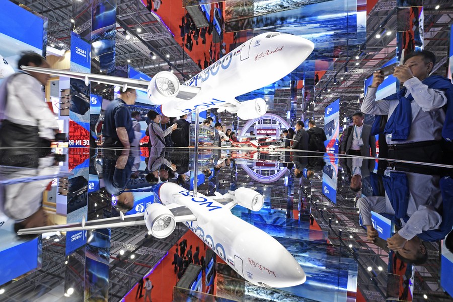 A model plane is on display at the Russia pavilion during the second China International Import Expo (CIIE) in Shanghai, east China, Nov. 6, 2019. (Xinhua/Wang Peng)