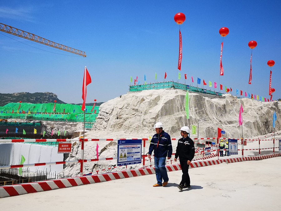 A Chinese worker and a Russian worker communicate with each other as they walk in a construction site where Units 7 and 8 of the Tianwan nuclear power plant are about to be built, in Lianyungang City, east China's Jiangsu Province, May 18, 2021. (Xinhua/Lu Huadong)