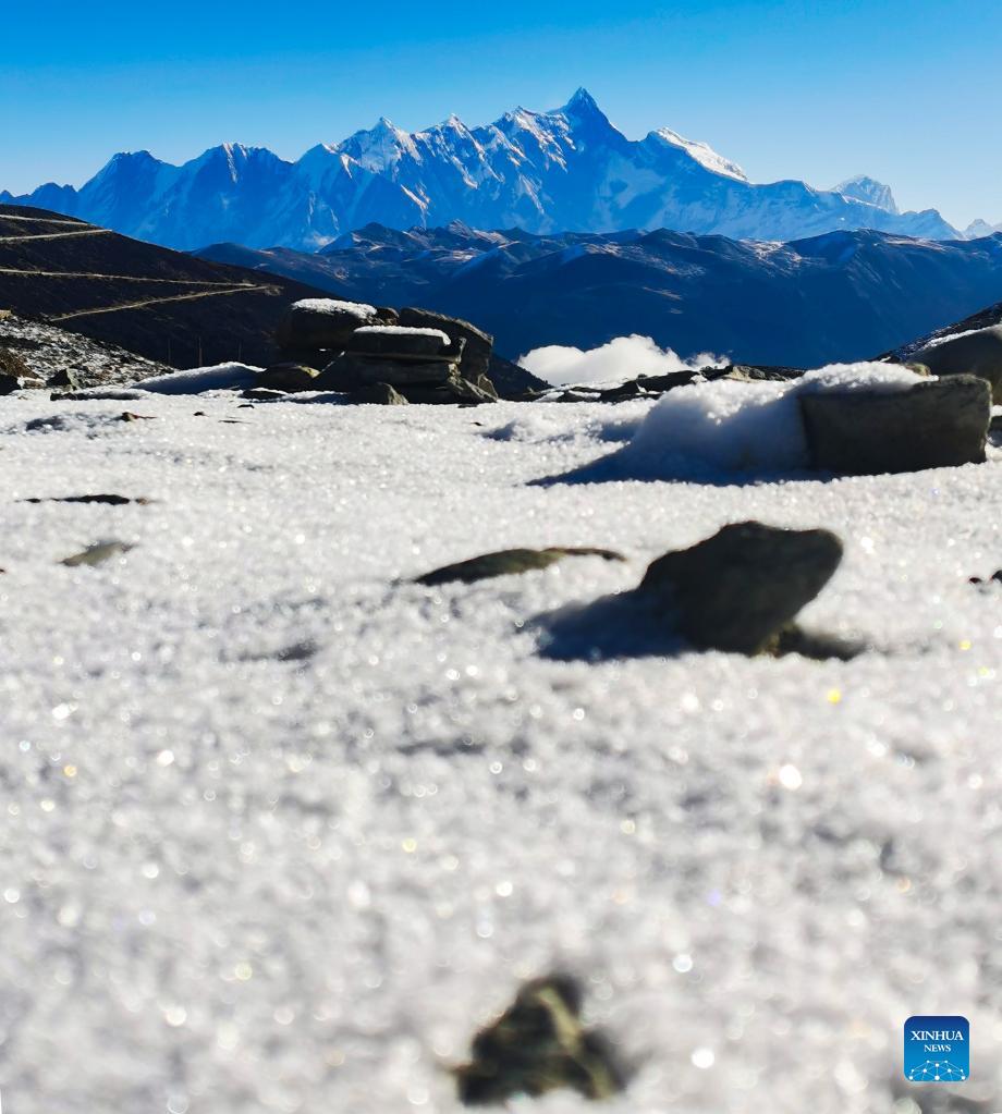 Photo taken on Dec. 16, 2021 with a mobile phone shows Mount Namjagbarwa in Nyingchi, southwest China's Tibet Autonomous Region. (Xinhua/Shen Hongbing)