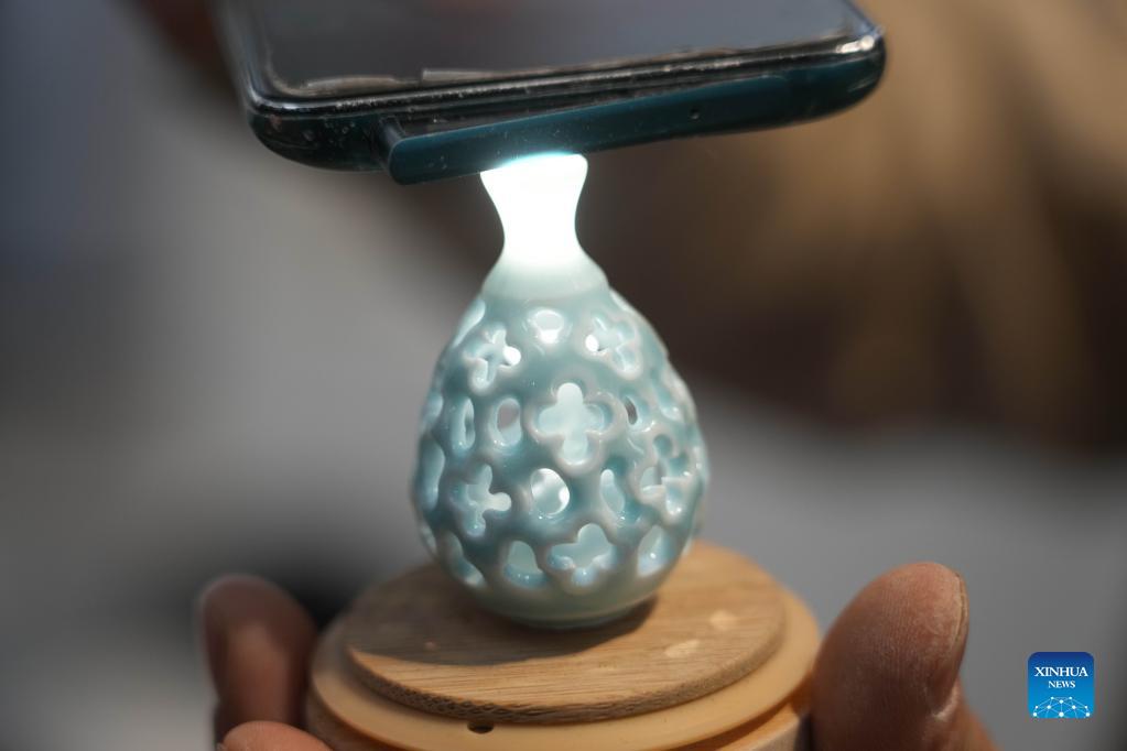 Wang Wenhua demonstrates a miniature vase in Jingdezhen of east China's Jiangxi Province, Dec. 14, 2021. Wang Wenhua, whose hometown is Fuyang in east China's Anhui Province, came to Jingdezhen of Jiangxi over a decade ago. Videos of Wang making miniature ceramics have gone viral on overseas Internet platforms recently. Wang decided to work on miniature ceramics after realizing that people care only about the largest ceramics while neglecting their opposite. He hopes that more and better pieces of miniature ceramics could be made in the future as the traditional Chinese culture is being recognized by the whole world gradually. (Xinhua/Zhou Mi)