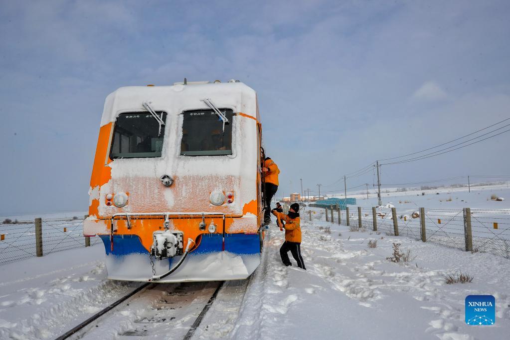 Workers board a snow removal vehicle running along the Karamey-Tacheng Railway in Tacheng of northwest China's Xinjiang Uygur Autonomous Region, Dec. 14, 2021. As heavy snow affects trains' operation in winter along the Karamey-Tacheng Railway from time to time, the Urumqi Railroad Bureau in Xinjiang has been putting upgraded snow removal vehicle into operation since Dec. 10 to clear accumulated snow more effectively and ensure the normal running of the railway. (Photo by Bai Fengliang/Xinhua)