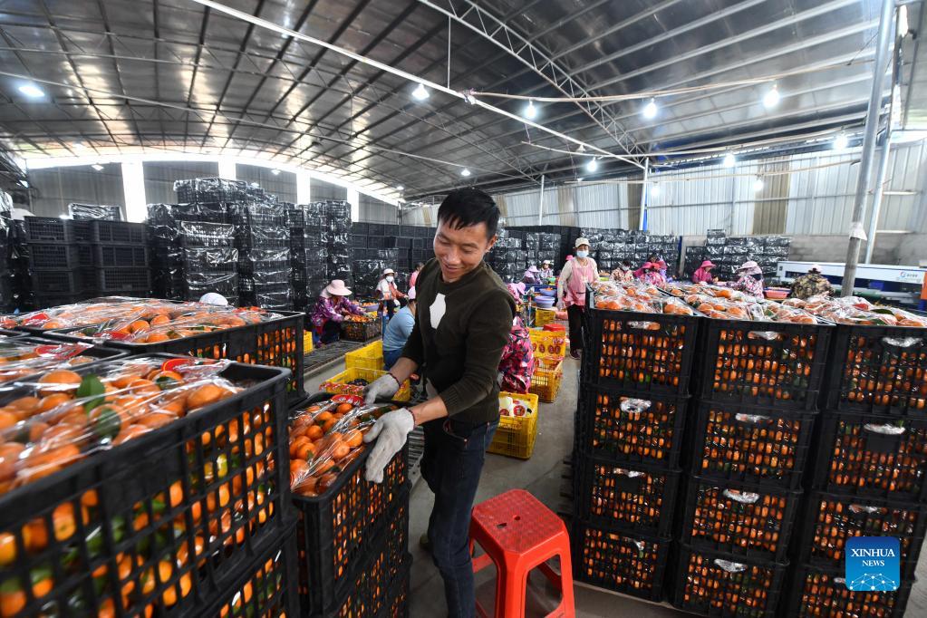 Villagers work at an orange storehouse in Luzhai County of Liuzhou City, south China's Guangxi Zhuang Autonomous Region, Dec. 16, 2021. Orange harvest season has arrived lately in Luzhai County. (Xinhua/Huang Xiaobang)