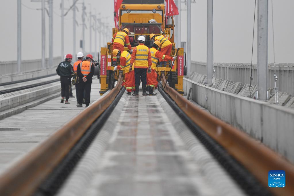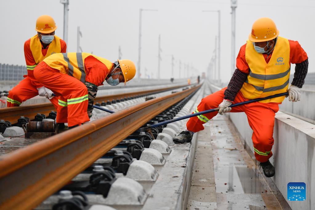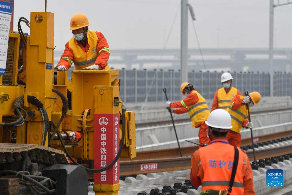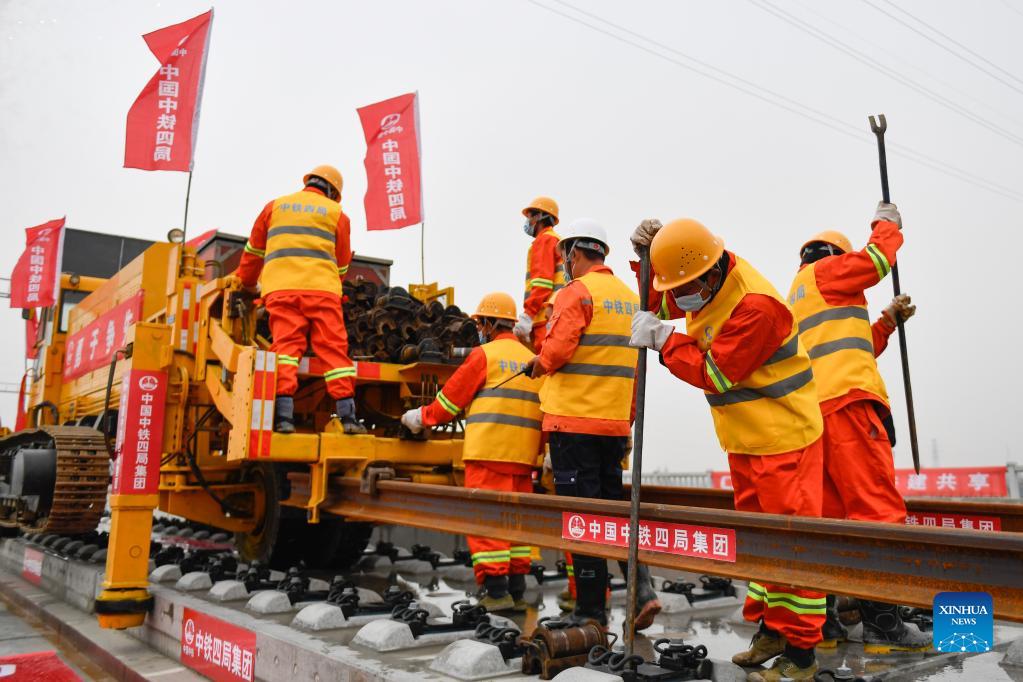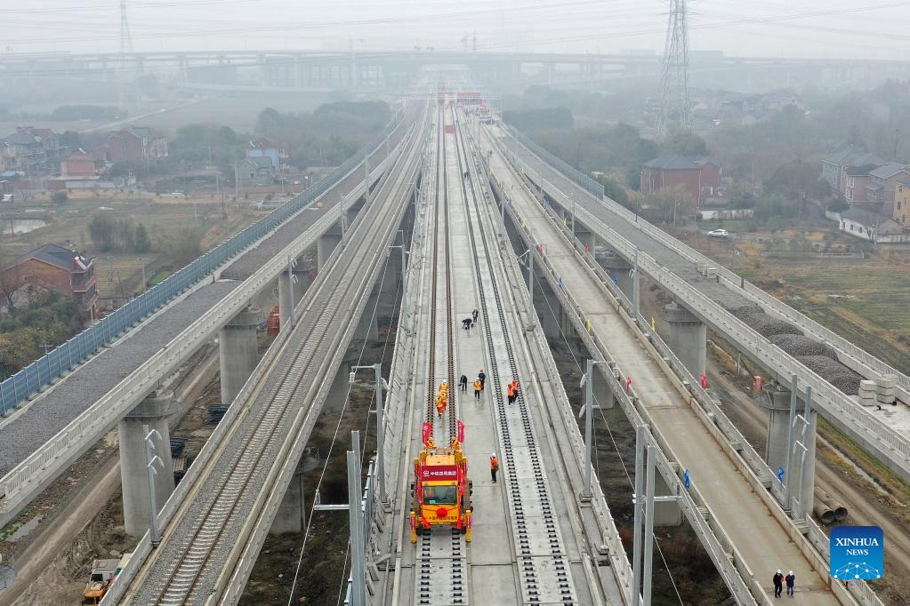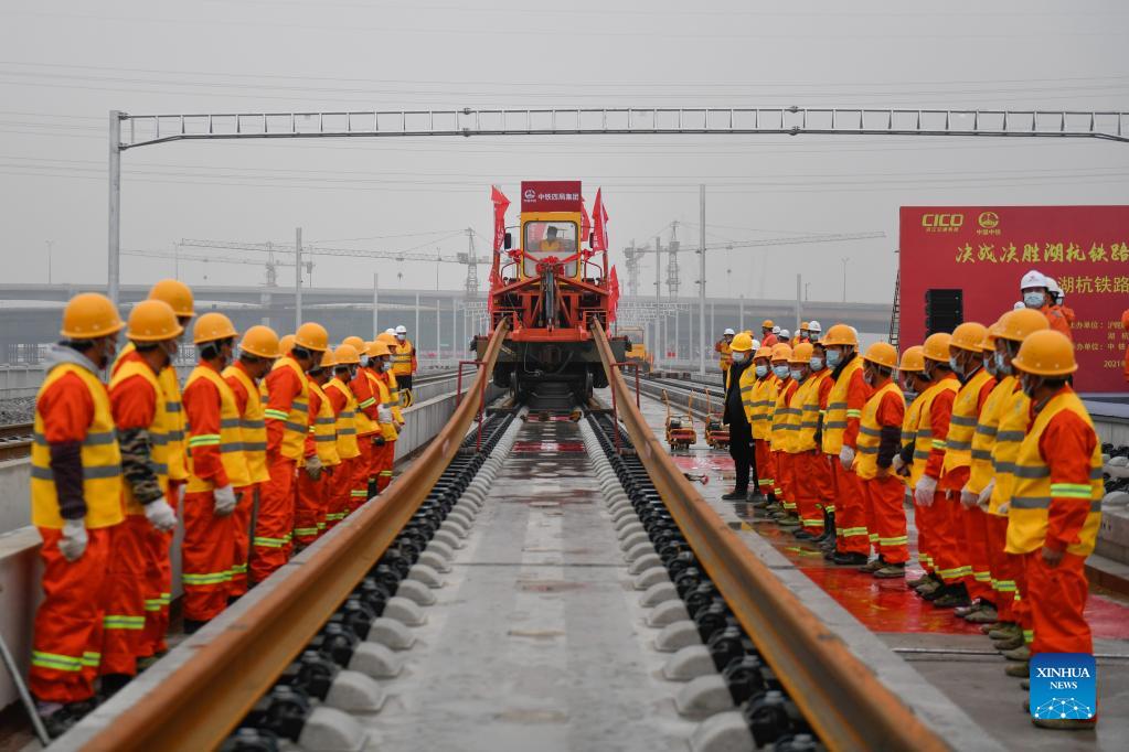 Workers of the China Railway No.4 Engineering Group lay the track of the Huzhou-Hangzhou high-speed railway in Yuhang District, Hangzhou City of east China's Zhejiang Province, Dec. 16, 2021. The construction of Huzhou-Hangzhou high-speed railway with designed speed of 350 kilometers per hour officially entered track-laying phase here Thursday. The line, which connects cities of Huzhou and Hangzhou, both in Zhejiang, is also a key auxiliary project to the 19th Asian Games Hangzhou 2022. (Xinhua/Huang Zongzhi)