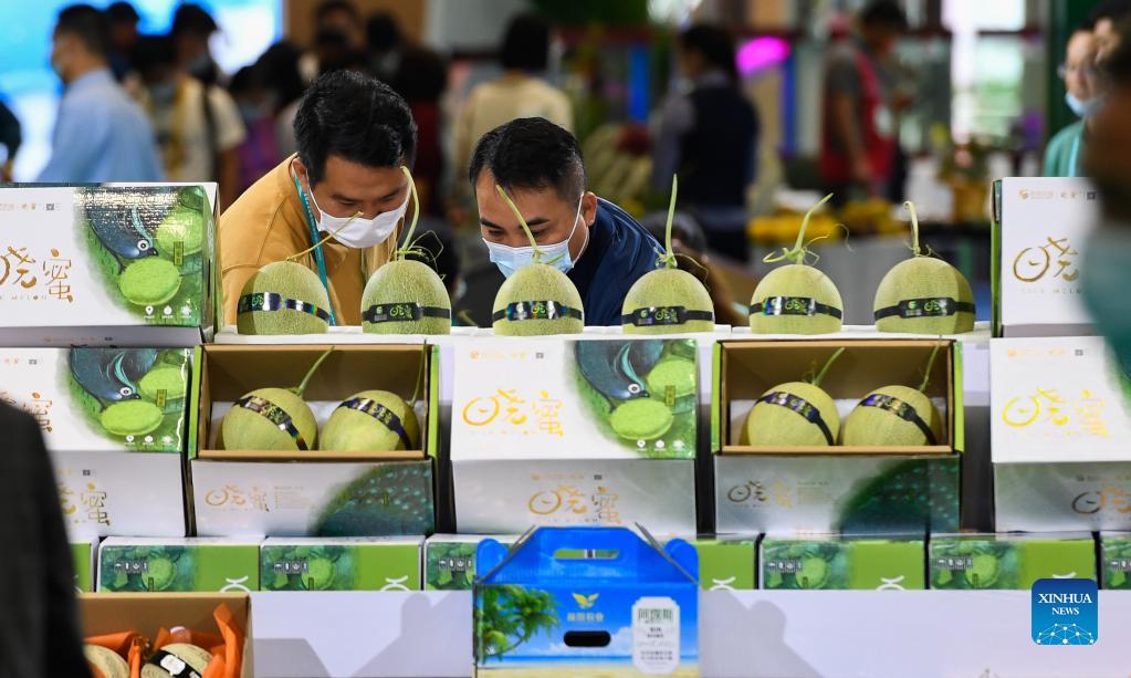 People visit the 2021 China (Hainan) International Tropical Agricultural Products Winter Trade Fair in Haikou, south China's Hainan Province, Dec. 16, 2021. The agricultural products trade fair, with an exhibition area of about 100,000 square meters, attracted the participation of nearly 2,000 enterprises. (Xinhua/Luo Jiang)