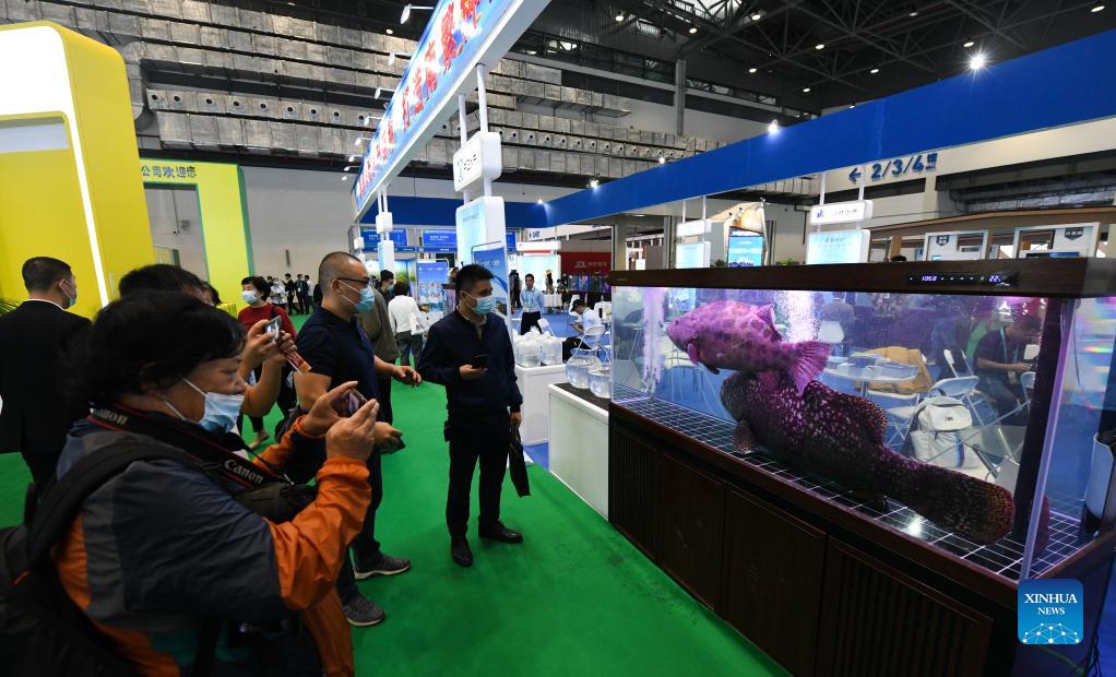 People visit the modern seed industry and digital agriculture hall of the 2021 China (Hainan) International Tropical Agricultural Products Winter Trade Fair in Haikou, south China's Hainan Province, Dec. 16, 2021. The agricultural products trade fair, with an exhibition area of about 100,000 square meters, attracted the participation of nearly 2,000 enterprises. (Xinhua/Yang Guanyu)