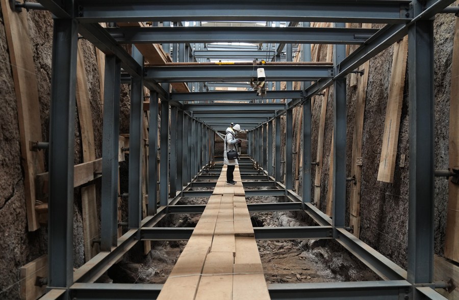 The mausoleum, located in Jiangcun Village on the eastern outskirts of Xi'an, is surrounded by more than 100 ancient tombs and outer burial pits. Excavation has been carried out in the area since 2017, with numerous relics unearthed including dressed pottery figurines, crossbows, and official seals.