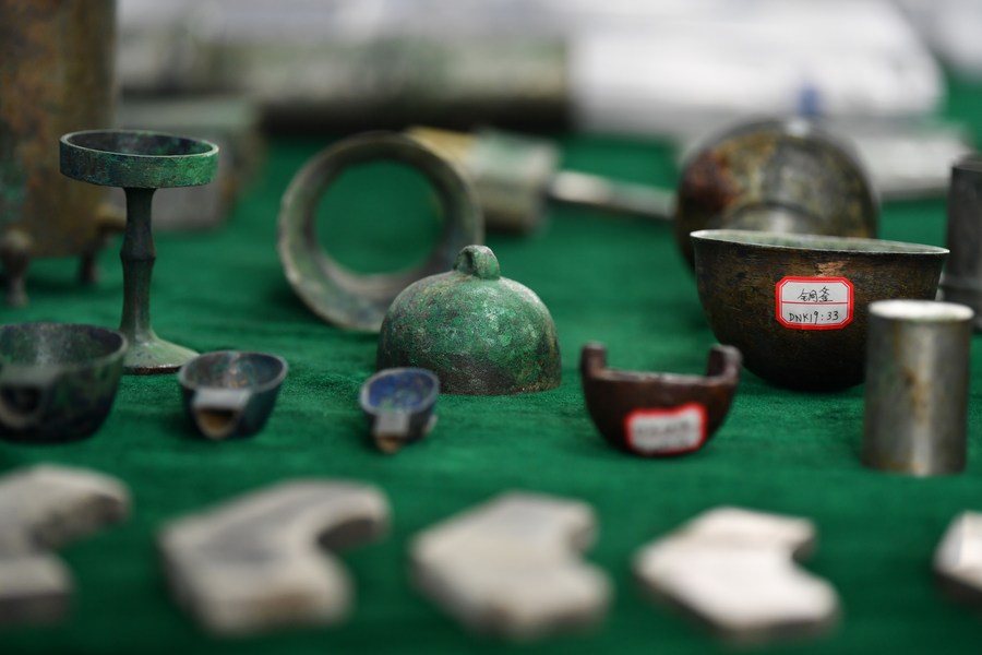 Photo taken on Dec. 16, 2021 shows cultural relics unearthed from the large-scale mausoleum and the mausoleum of Empress Dowager Bo, mother of Emperor Wendi of the Western Han Dynasty (202 BC-AD 25), in northwest China's Shaanxi Province. (Xinhua/Zhang Bowen)