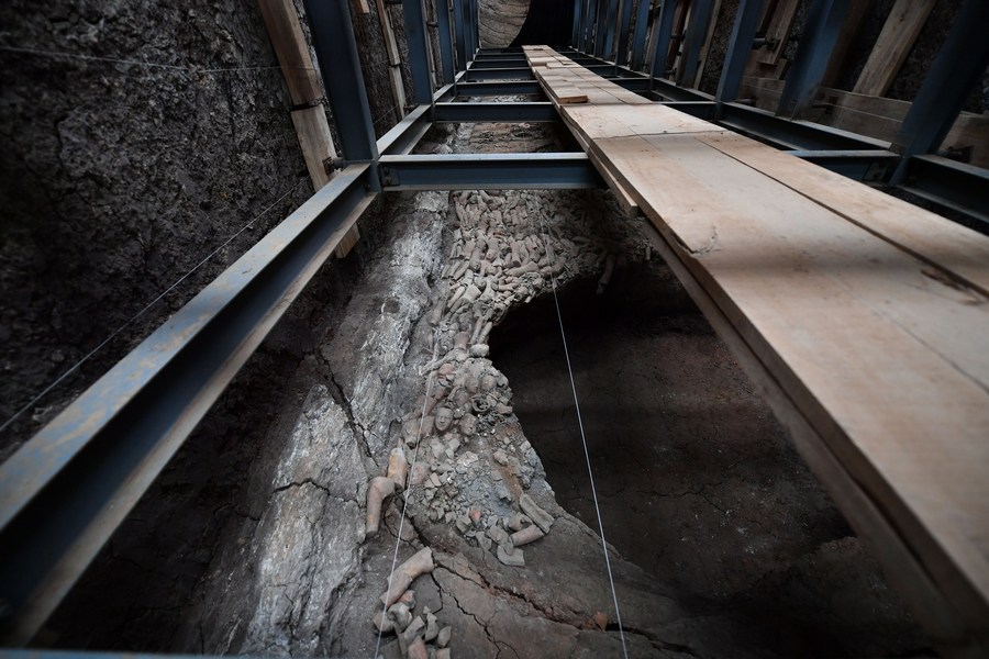 Photo taken on Dec. 16, 2021 shows ancient pottery horses unearthed from the large-scale mausoleum located in Jiangcun Village on the eastern outskirts of Xi'an, northwest China's Shaanxi Province. (Xinhua/Zhang Bowen)