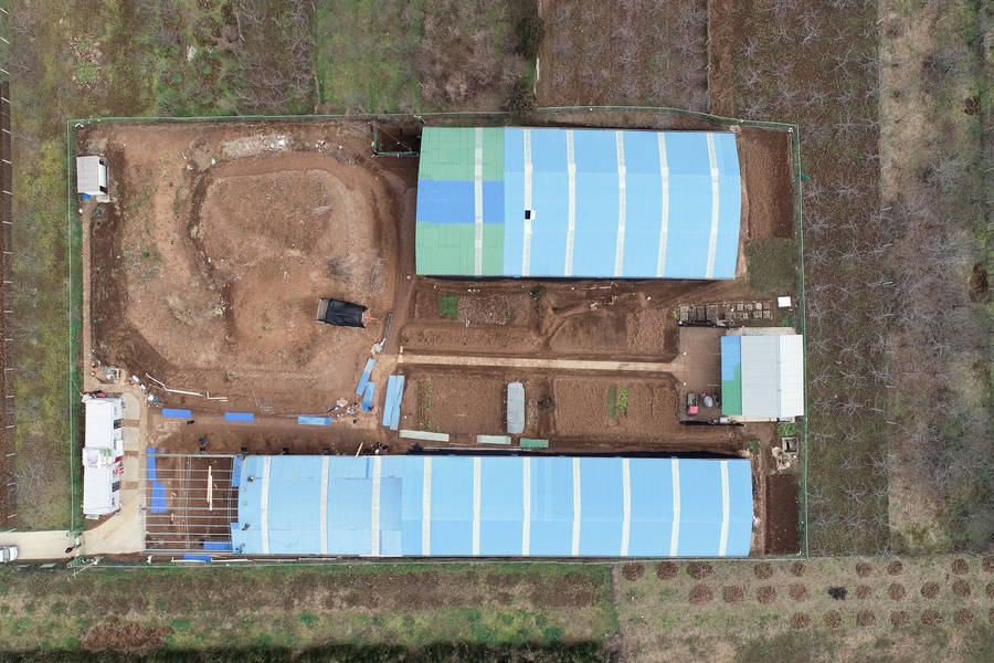 Aerial photo taken on Dec. 16, 2021 shows the excavation site of the large-scale mausoleum located in Jiangcun Village on the eastern outskirts of Xi'an, northwest China's Shaanxi Province. (Xinhua/Zhang Bowen)