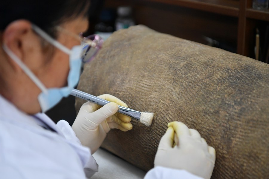 A staff member cleans cultural relics unearthed from the large-scale mausoleum located in Jiangcun Village on the eastern outskirts of Xi'an, northwest China's Shaanxi Province, Dec. 16, 2021. (Xinhua/Zhang Bowen)