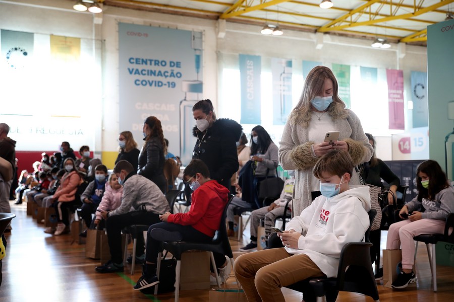 Children are seen with their parents after receiving the COVID-19 vaccine at a vaccination center in Cascais, Portugal, on Dec. 18, 2021. Portugal started vaccinating children between the ages of five and 11 against COVID-19 from Saturday. (Photo by Pedro Fiuza/Xinhua)