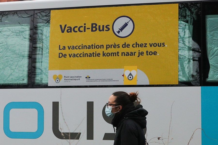 A woman passes a bus for vaccination in Brussels, Belgium, Nov. 30, 2021. (Xinhua/Zheng Huansong)