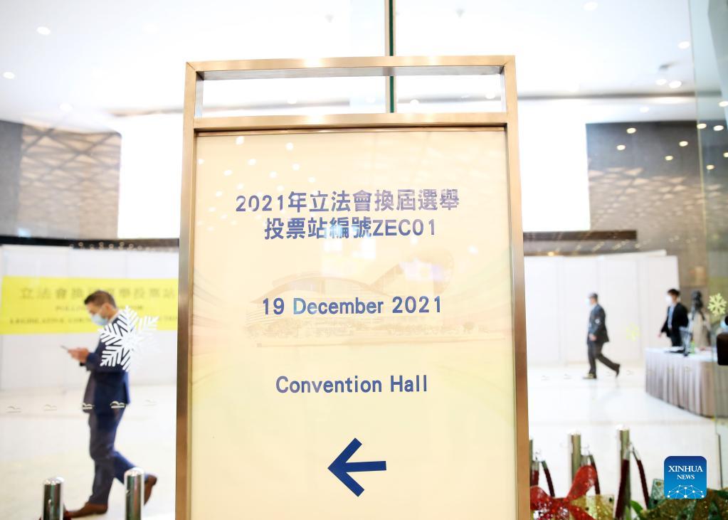 Staff members are seen at the polling station of the Hong Kong Convention and Exhibition Center in Hong Kong, south China, Dec. 19, 2021. The election for the seventh-term Legislative Council (LegCo) of the Hong Kong Special Administrative Region (HKSAR) kicked off Sunday morning, the first since the improvement to the HKSAR electoral system. More than 600 polling stations opened at 8:30 a.m. local time (0030 GMT) across Hong Kong for about 4.5 million registered electors to cast vote. (Xinhua/Li Gang)
