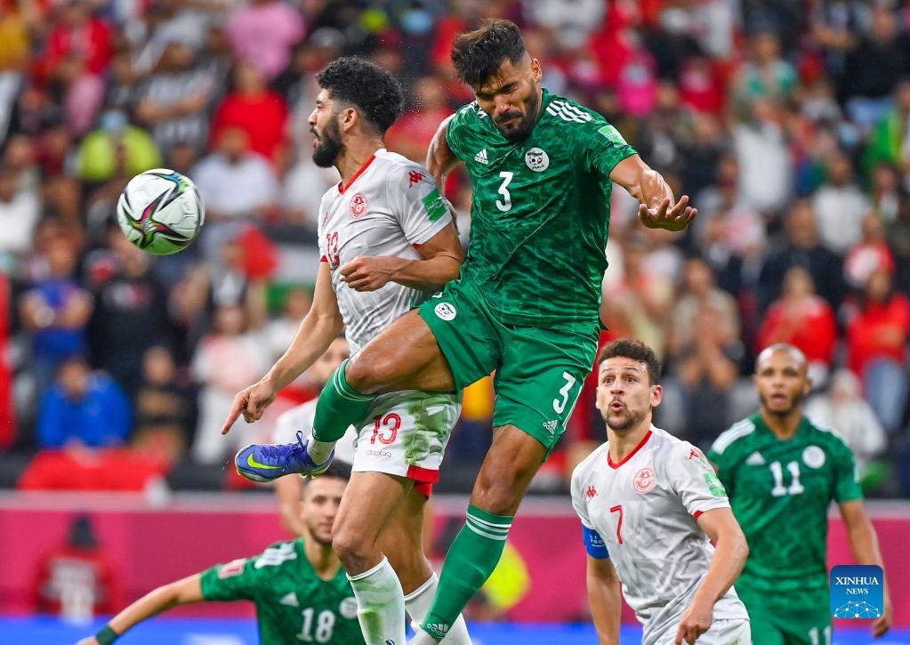 Benayada Hocine (top R) of Algeria vies with Sassi Ferjani of Tunisia during the FIFA Arab Cup Qatar 2021 final match between Tunisia and Algeria at Al Bayt Stadium in Doha, Qatar, Dec. 18, 2021. (Photo by Nikku/Xinhua)