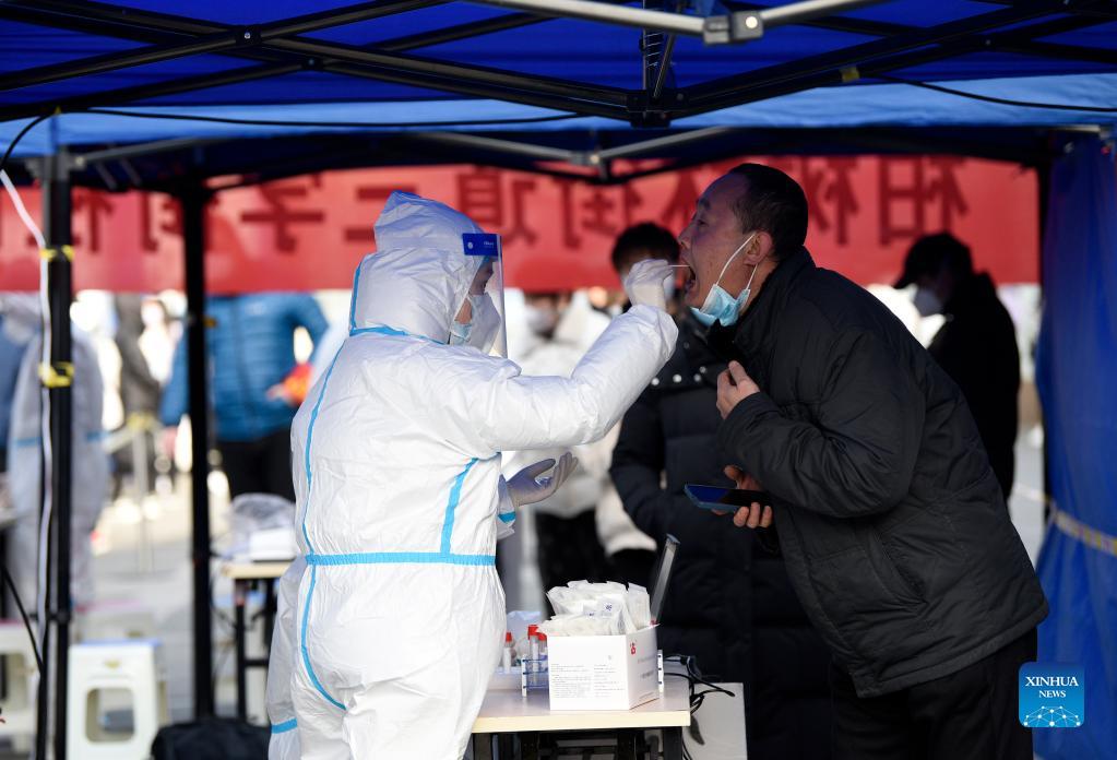 A medical worker collects a swab sample from a resident at a COVID-19 testing site in Xi'an, northwest China's Shaanxi Province, Dec. 17, 2021. Xi'an has registered a total of 13 locally transmitted confirmed COVID-19 cases and four asymptomatic cases since new local infections were reported. Authorities in Xi'an have implemented various measures such as epidemiological investigations, temporary quarantine and massive nucleic acid testing to fight against the recent COVID-19 resurgence. (Xinhua/Liu Xiao)