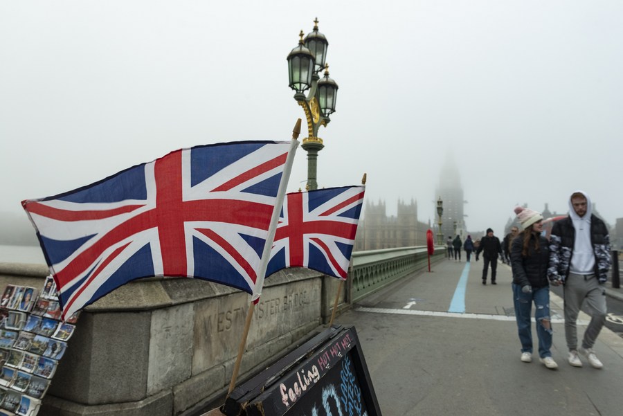 People walk on Westminster Bridge in the mist in London, Britian, Dec. 19, 2021. (Photo by Stephen Chung/Xinhua)