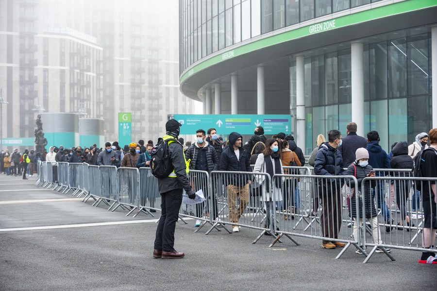 People queue for a vaccine jab at a mass vaccination center at Wembley Stadium in London, Britian, Dec. 19, 2021. (Photo by Stephen Chung/Xinhua)