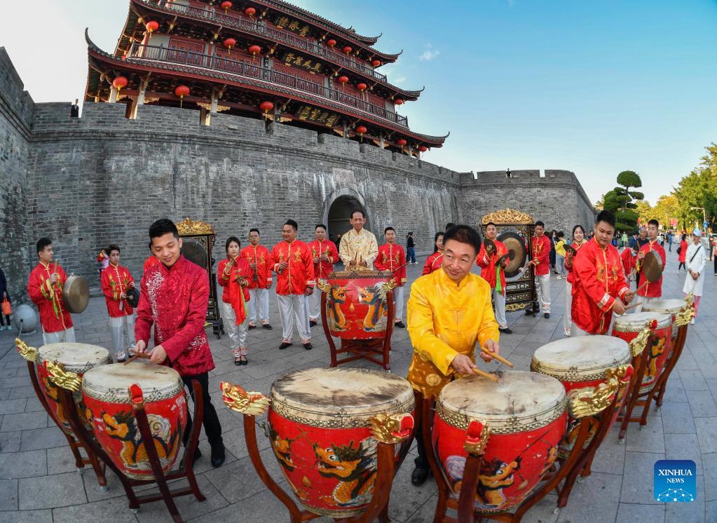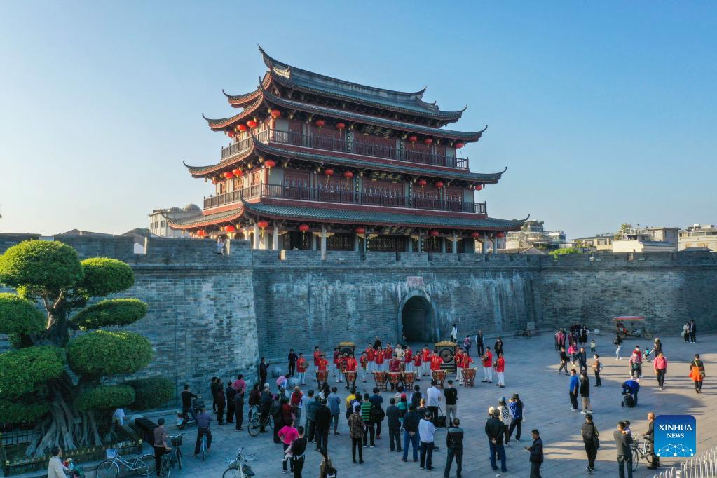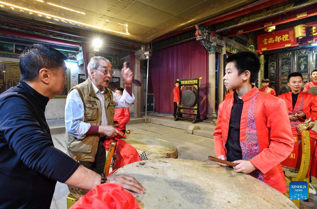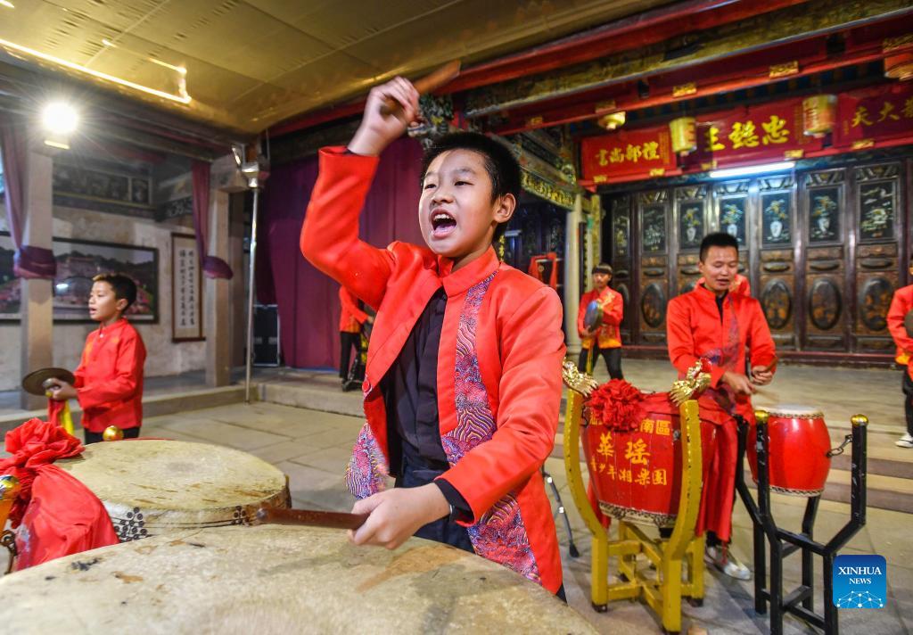 Artists perform a traditional Chaozhou drum music piece in Chaozhou, south China's Guangdong Province, Dec. 14, 2021. Chaozhou music refers to all types of folk music popular in the Chaoshan region of eastern Guangdong Province in south China. With a history dating back over 1,000 years, traditional instruments such as suona, yehu, erxian (two-string fiddles), gongs, and drums are commonly used in performances. This traditional art form has been well protected and inherited by the younger generation in recent years, as more and more young people nowadays learn the music and the traditional culture. (Xinhua/Liu Dawei)