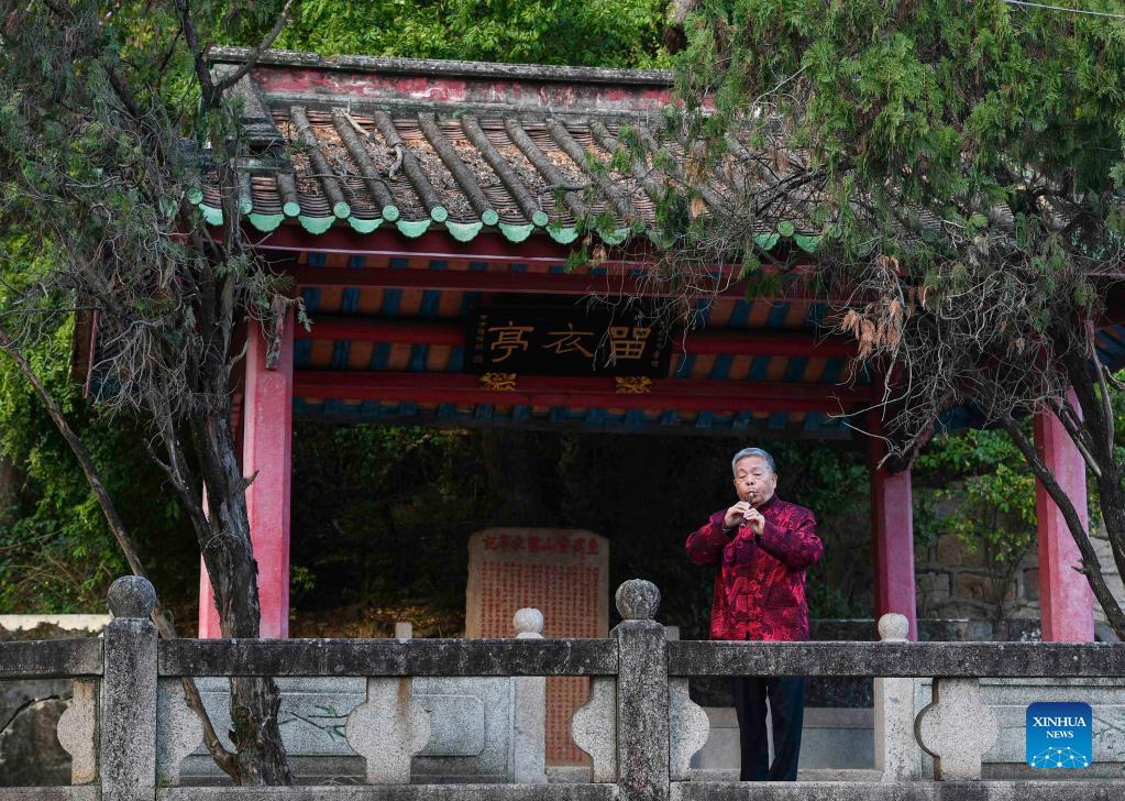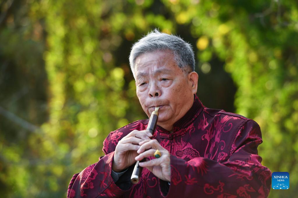 Musician Zheng Xiangming,76, practices Chaozhou music with Ditao, a traditional Chinese musical instrument in Shantou, south China's Guangdong Province, Dec. 16, 2021. Chaozhou music refers to all types of folk music popular in the Chaoshan region of eastern Guangdong Province in south China. With a history dating back over 1,000 years, traditional instruments such as suona, yehu, erxian (two-string fiddles), gongs, and drums are commonly used in performances. This traditional art form has been well protected and inherited by the younger generation in recent years, as more and more young people nowadays learn the music and the traditional culture. (Xinhua/Liu Dawei)