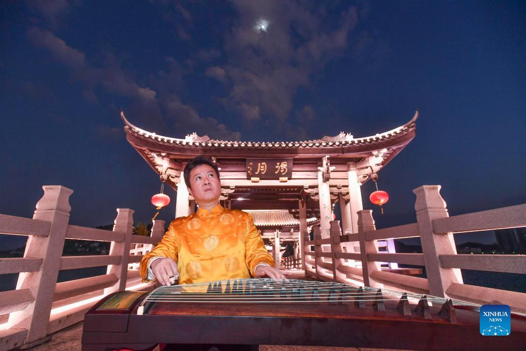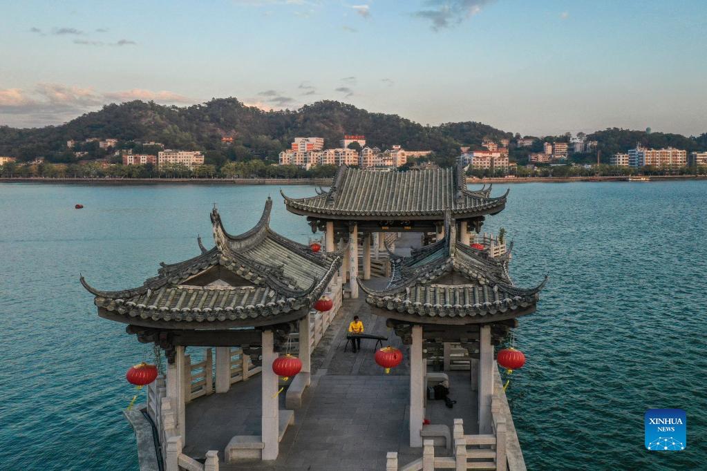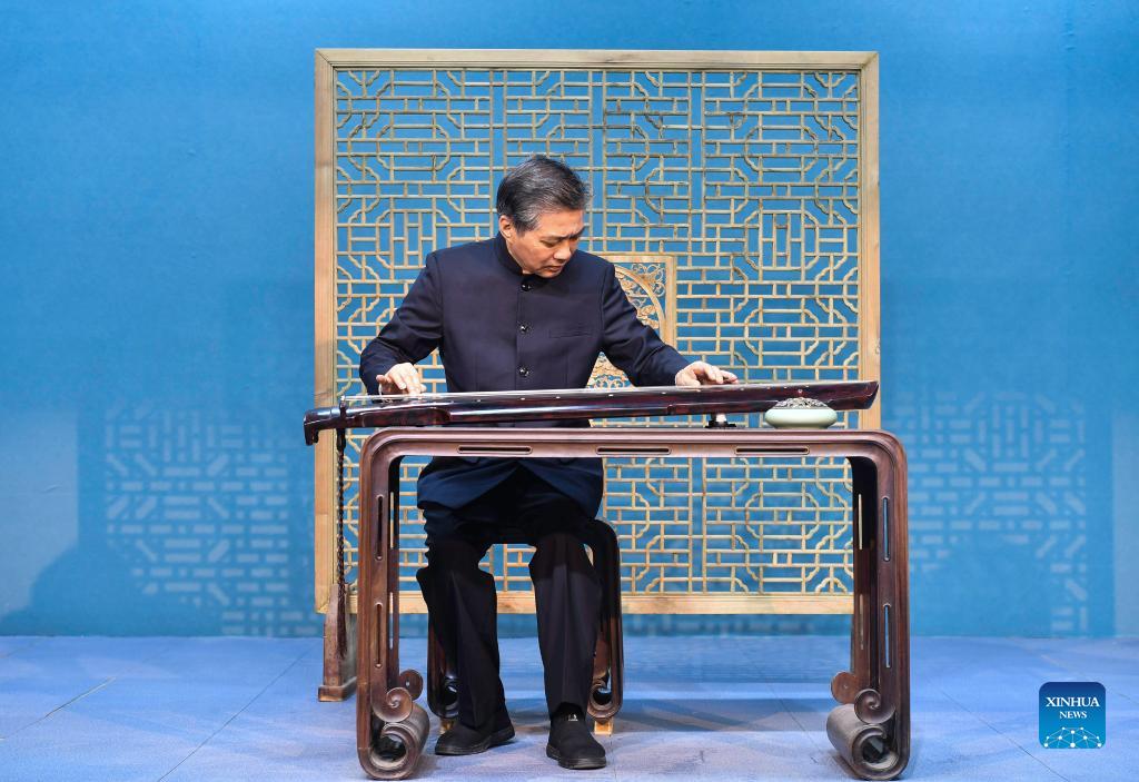 Musician Chen Songjie plays Chaozhou music with Guqin, a traditional Chinese musical instrument, in Shantou, south China's Guangdong Province, Dec. 15, 2021. Chaozhou music refers to all types of folk music popular in the Chaoshan region of eastern Guangdong Province in south China. With a history dating back over 1,000 years, traditional instruments such as suona, yehu, erxian (two-string fiddles), gongs, and drums are commonly used in performances. This traditional art form has been well protected and inherited by the younger generation in recent years, as more and more young people nowadays learn the music and the traditional culture. (Xinhua/Liu Dawei)