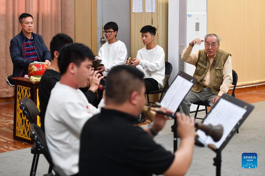 Musician Ding Zengqin (1st R), 74, teaches young people how to play Chaozhou music in Shantou, south China's Guangdong Province, Dec. 15, 2021. Chaozhou music refers to all types of folk music popular in the Chaoshan region of eastern Guangdong Province in south China. With a history dating back over 1,000 years, traditional instruments such as suona, yehu, erxian (two-string fiddles), gongs, and drums are commonly used in performances. This traditional art form has been well protected and inherited by the younger generation in recent years, as more and more young people nowadays learn the music and the traditional culture. (Xinhua/Liu Dawei)