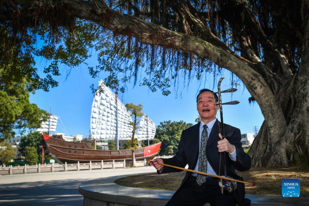 Musician Zheng Bingzhao, 87, plays Chaozhou music with Yehu, a traditional Chinese musical instrument, in Shantou, south China's Guangdong Province, Dec. 16, 2021. Chaozhou music refers to all types of folk music popular in the Chaoshan region of eastern Guangdong Province in south China. With a history dating back over 1,000 years, traditional instruments such as suona, yehu, erxian (two-string fiddles), gongs, and drums are commonly used in performances. This traditional art form has been well protected and inherited by the younger generation in recent years, as more and more young people nowadays learn the music and the traditional culture. (Xinhua/Liu Dawei)