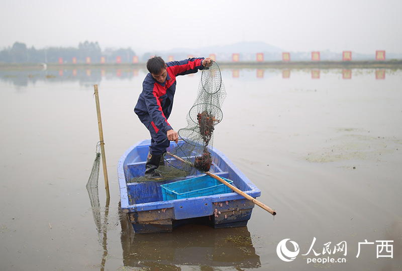 A farmer catches crayfish at a rice-crayfish farming base in Wanglong village, Shizui town, Guigang city, south China’s Guangxi Zhuang Autonomous Region. (Peoples Daily Online/Wu Mingjiang)