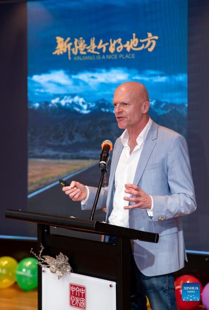 Alex Brereton of Citrus Media speaks at the Beijing 2022 &Winter Travel around China Photography Exhibition at China Cultural Centre in Sydney, Australia, Dec. 21, 2021. (Xinhua/Bai Xuefei)