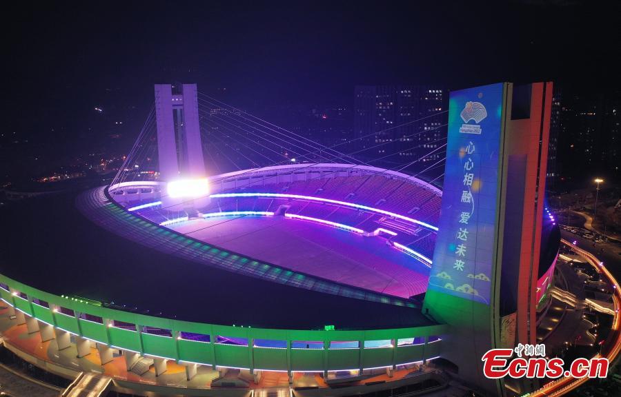 The lighting effect of the 2022 Asian Games theme is displayed at the Huanglong Sports Centre Stadium in Hangzhou, east China's Zhejiang Province, Dec. 20, 2021. (Photo: China News Service/Wang Gang)