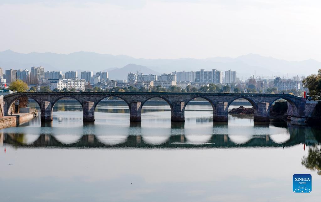 Photo shows the repaired Zhenhai Bridge in Tunxi District of Huangshan, east China's Anhui Province, Dec. 21, 2021. An ancient bridge destroyed by floods in east China's Anhui Province will reopen soon after repair, local authorities said. The repair work, which started on Nov. 13, 2020, has been completed and passed quality inspection on Tuesday. The Zhenhai Bridge, built during the Ming Dynasty (1368-1644), was a state-level cultural relics protection site in the city of Huangshan. Floodwaters destroyed the 131-meter-long bridge during a heavy rainstorm on July 7, 2020. (Photo by Shi Yalei/Xinhua)