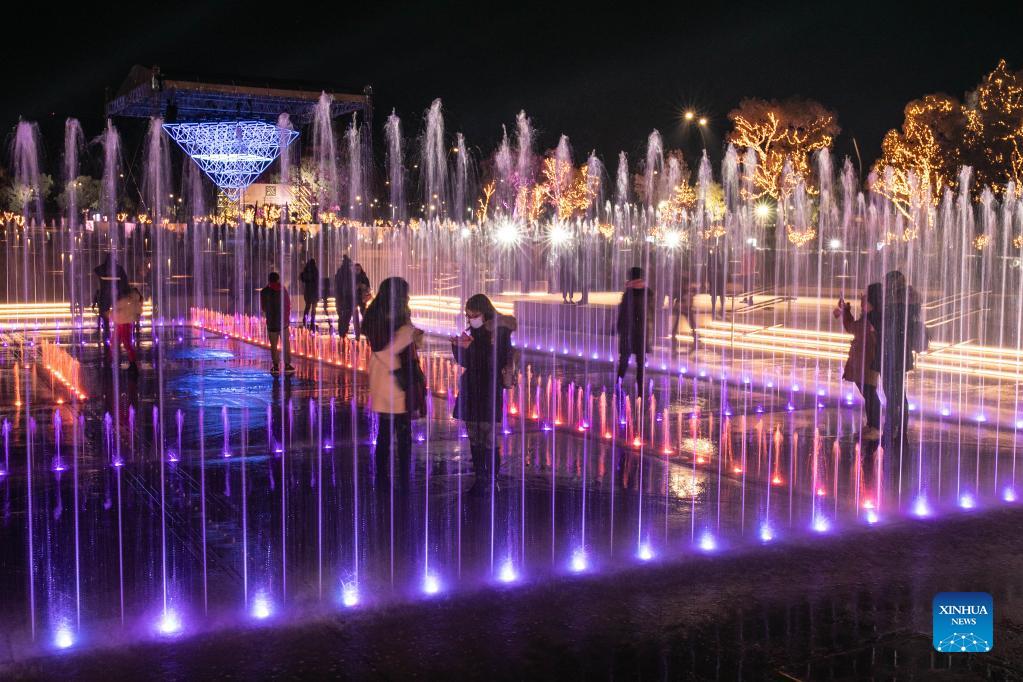 People stand around a fountain at the Experience Park in Elliniko in Athens, Greece, Dec. 20, 2021. The Experience Park opened to the public on Monday with decorations for the festive season. (Photo by Lefteris Partsalis/Xinhua)