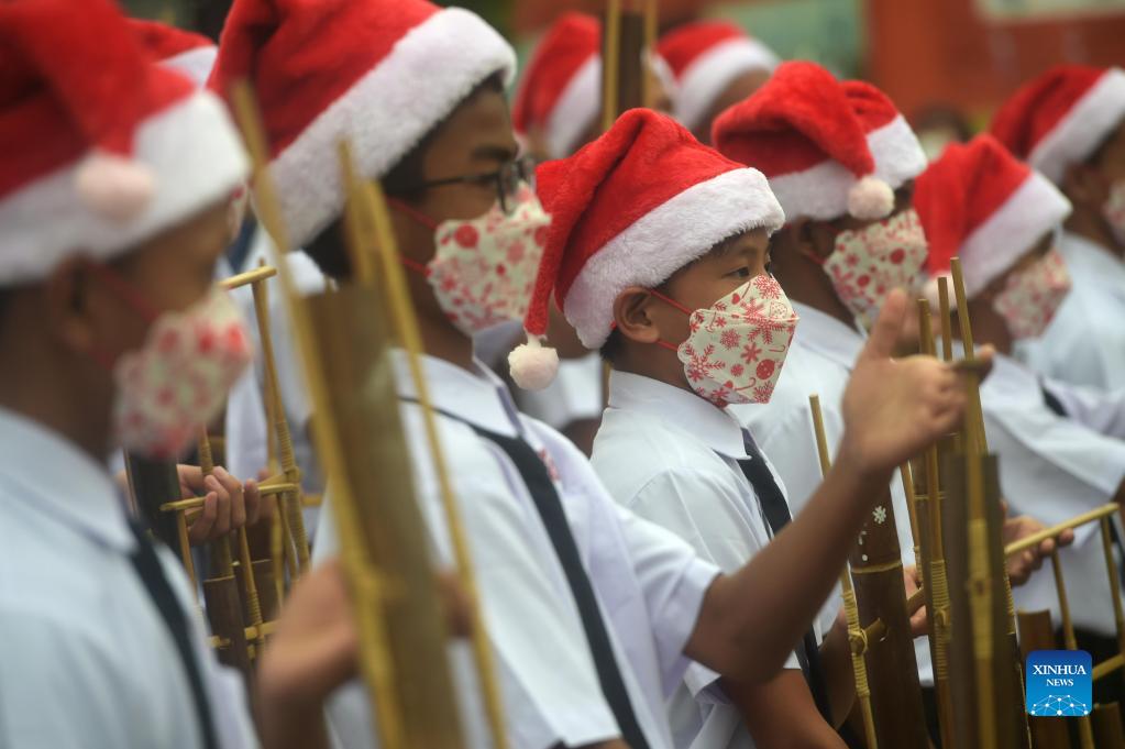 Students wearing masks participate in a Christmas carol service at the roadside in Jakarta, Indonesia, Dec. 21, 2021. (Xinhua/Zulkarnain)