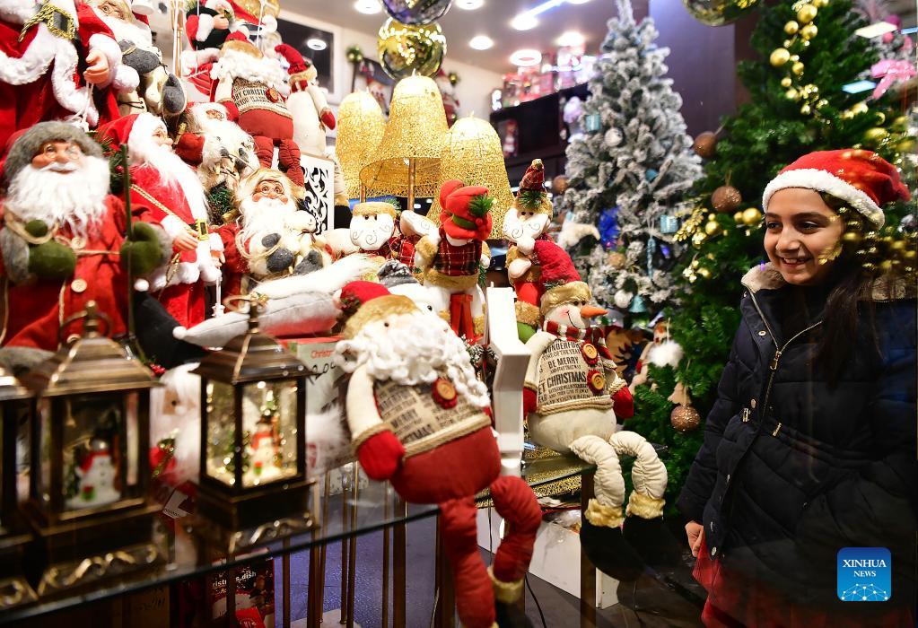 A girl enjoys the holiday atmosphere at night in Damascus, capital of Syria, Dec. 20, 2021. (Photo by Ammar Safarjalani/Xinhua)