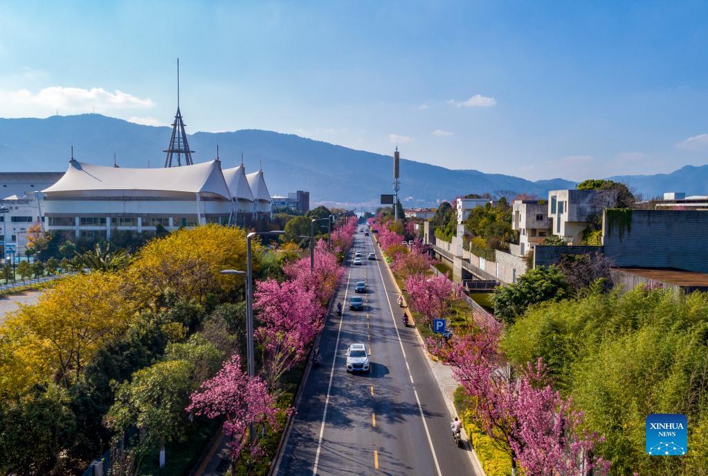 Photo taken on Dec. 21, 2021 shows cherry trees blooming along the streets in Kunming City, southwest China's Yunnan Province. (Xinhua/Chen Xinbo)