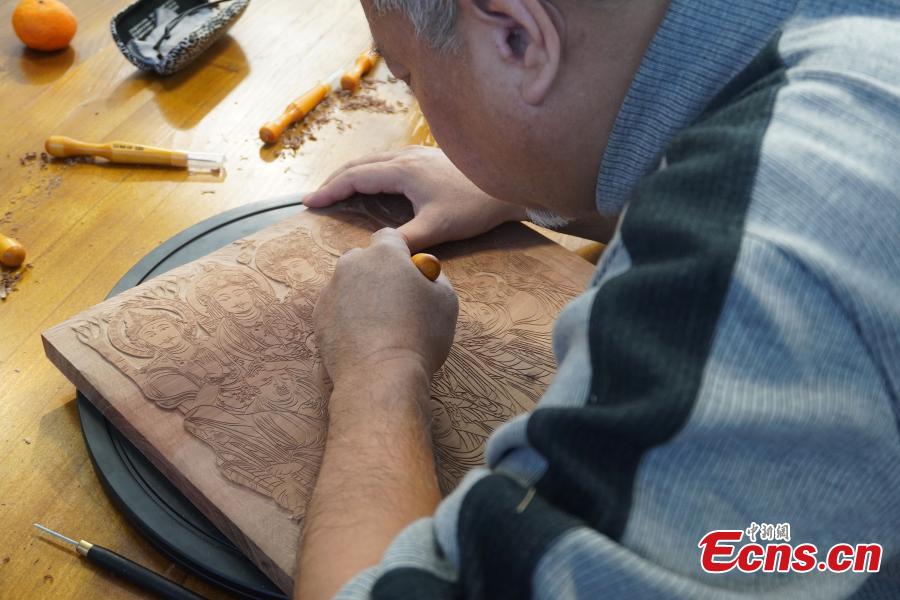 Xu Jinlin carves on woodblocks in Lanzhou, northwest China's Gansu Province, Dec. 21, 2021. (Photo: China News Service/Jiumeidanzeng)