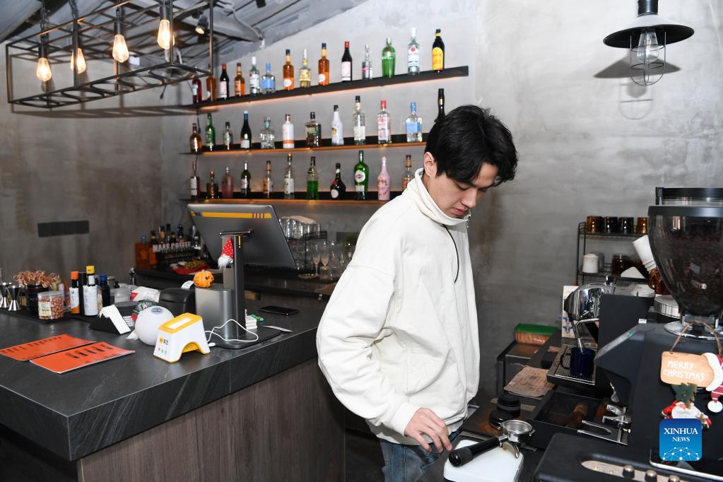 A staff member makes coffee at a coffee shop at a cultural block in southwest China's Chongqing Municipality, Dec. 22, 2021. Covering an area of over 40 mu (about 26,667 square meters), the machinery plant-turned cultural block has been revitalized after its upgrading. (Xinhua/Wang Quanchao)
