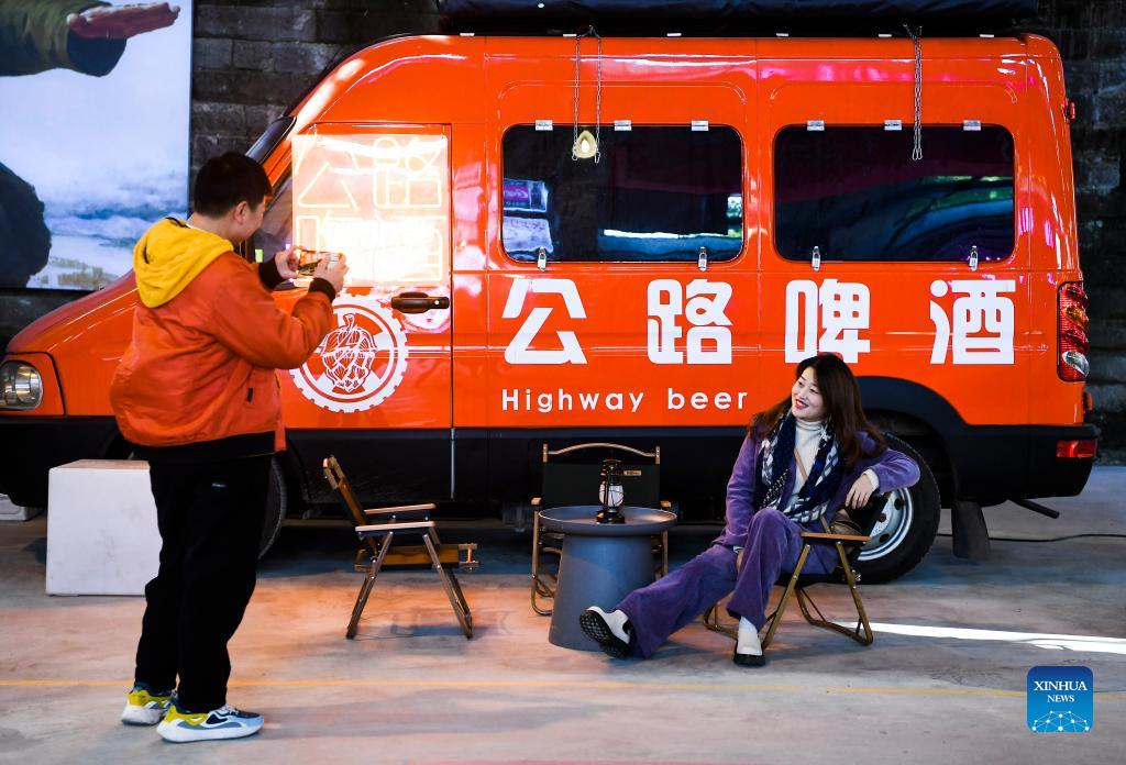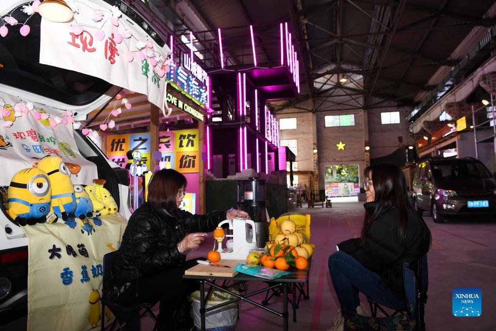 A visitor (R) purchases a cup of juice at a cultural block in southwest China's Chongqing Municipality, Dec. 22, 2021. Covering an area of over 40 mu (about 26,667 square meters), the machinery plant-turned cultural block has been revitalized after its upgrading. (Xinhua/Wang Quanchao)