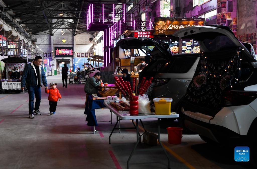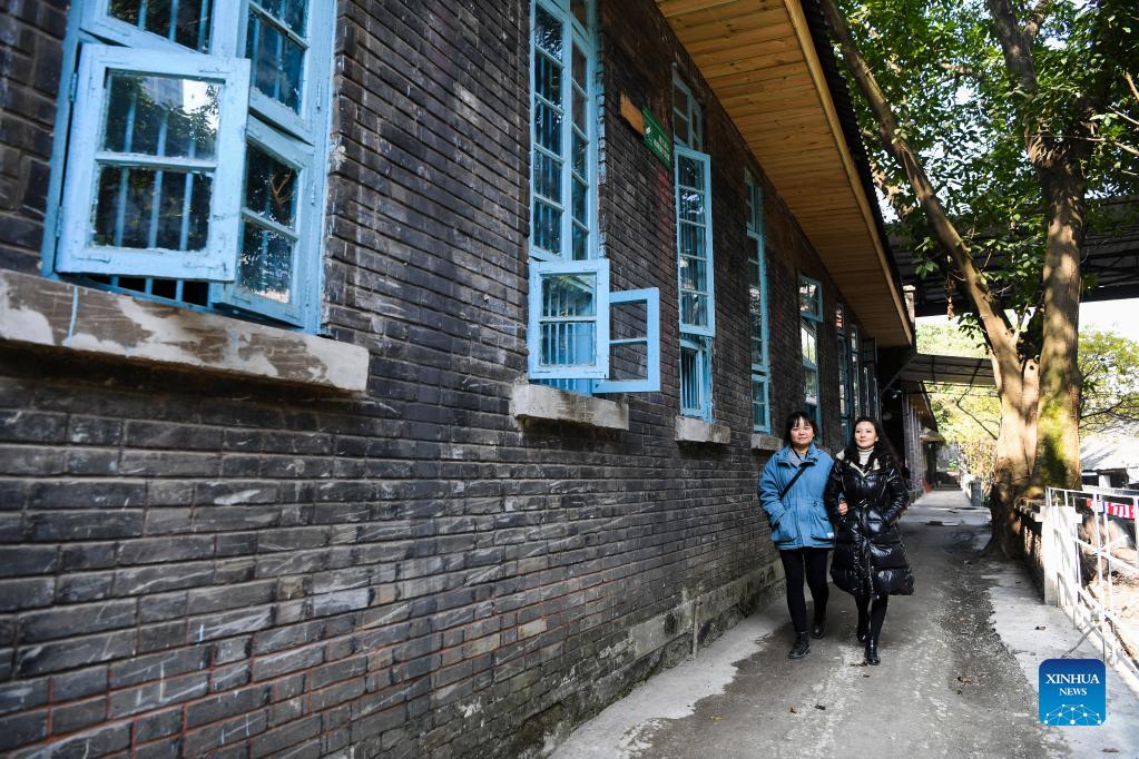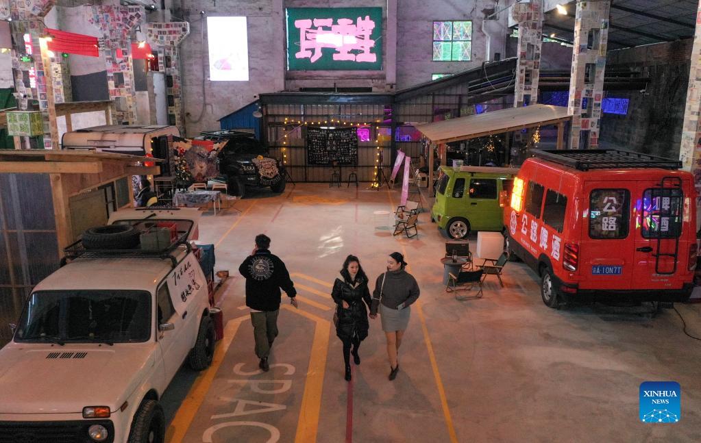 Visitors tour a cultural block in southwest China's Chongqing Municipality, Dec. 22, 2021. Covering an area of over 40 mu (about 26,667 square meters), the machinery plant-turned cultural block has been revitalized after its upgrading. (Xinhua/Wang Quanchao)