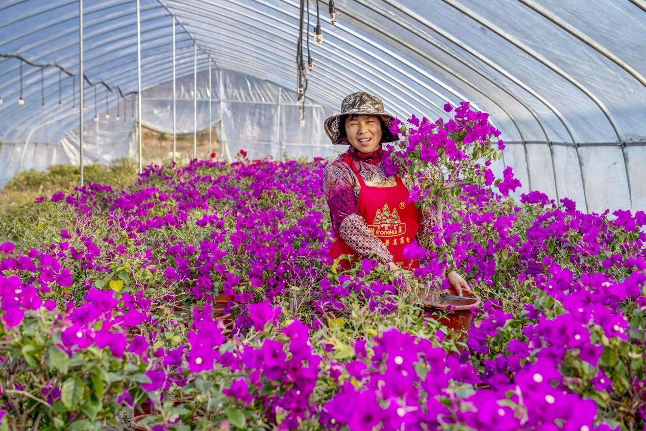A farmer carries potted flowers at a flower planting base in Tianshi township, Xianju county, Taizhou city, east China’s Zhejiang province, Dec. 9, 2021. (People’s Daily Online/Chen Yueming)