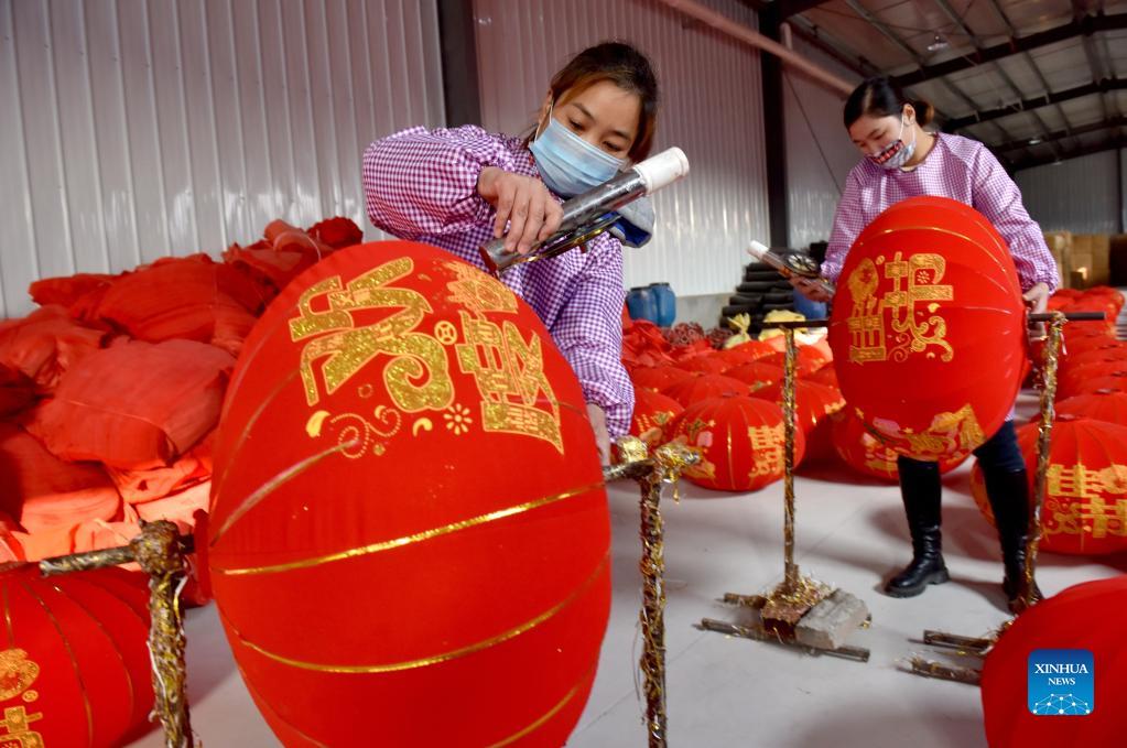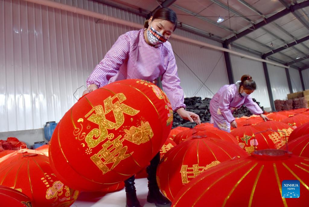 Staff members work at a lantern workshop in Dongsanzhao Township of Nanhe District of Xingtai, north China's Hebei Province, Dec. 22, 2021. Villagers are busy making lanterns for the upcoming festival season. (Xinhua/Zhu Xudong)