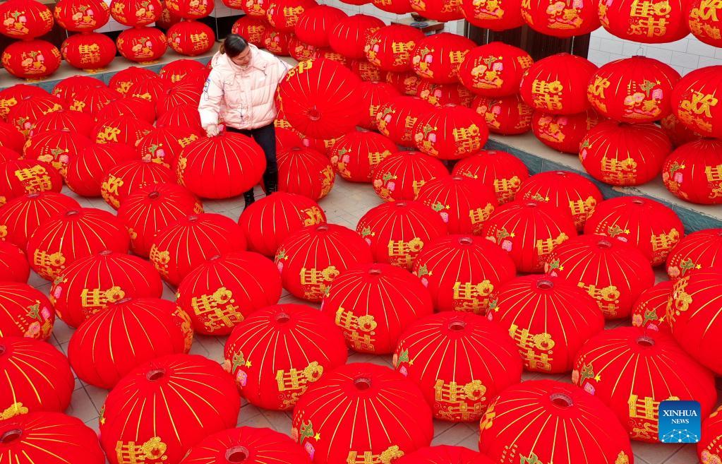 A staff member works at a lantern workshop in Dongsanzhao Township of Nanhe District of Xingtai, north China's Hebei Province, Dec. 22, 2021. Villagers are busy making lanterns for the upcoming festival season. (Xinhua/Zhu Xudong)