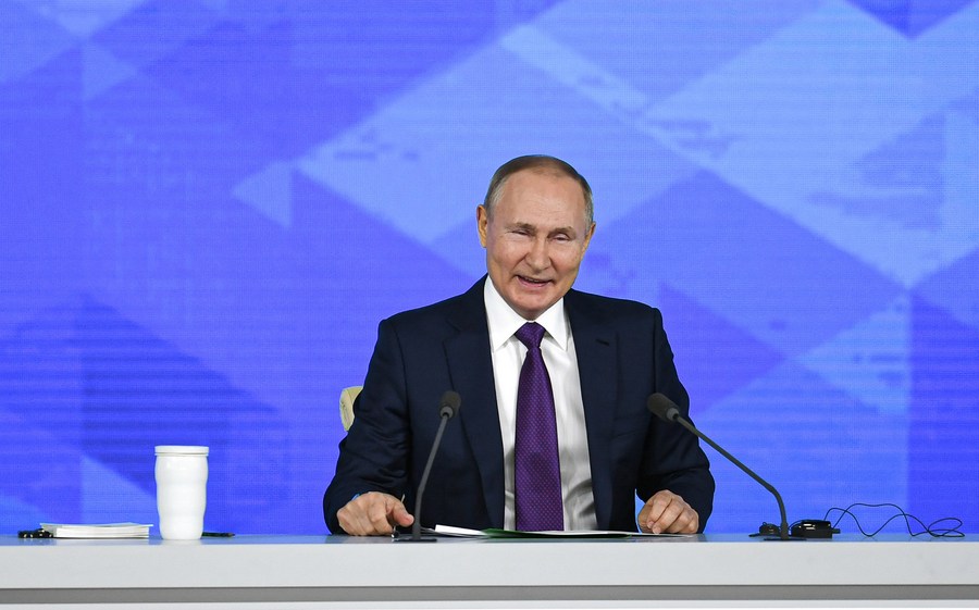 Russian President Vladimir Putin attends his annual press conference in Moscow, Russia, Dec. 23, 2021. (Xinhua/Evgeny Sinitsyn)