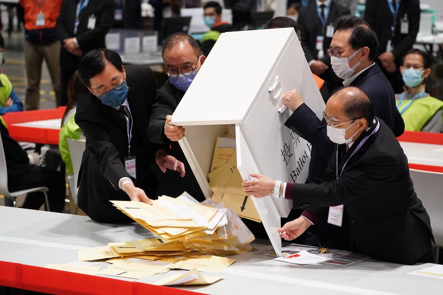 Chairman of the China's Hong Kong Special Administrative Region (HKSAR) Electoral Affairs Commission Fung Wah (2nd R) opens a ballot box in Hong Kong, south China, Dec. 19, 2021. (Xinhua/Lui Siu Wai)