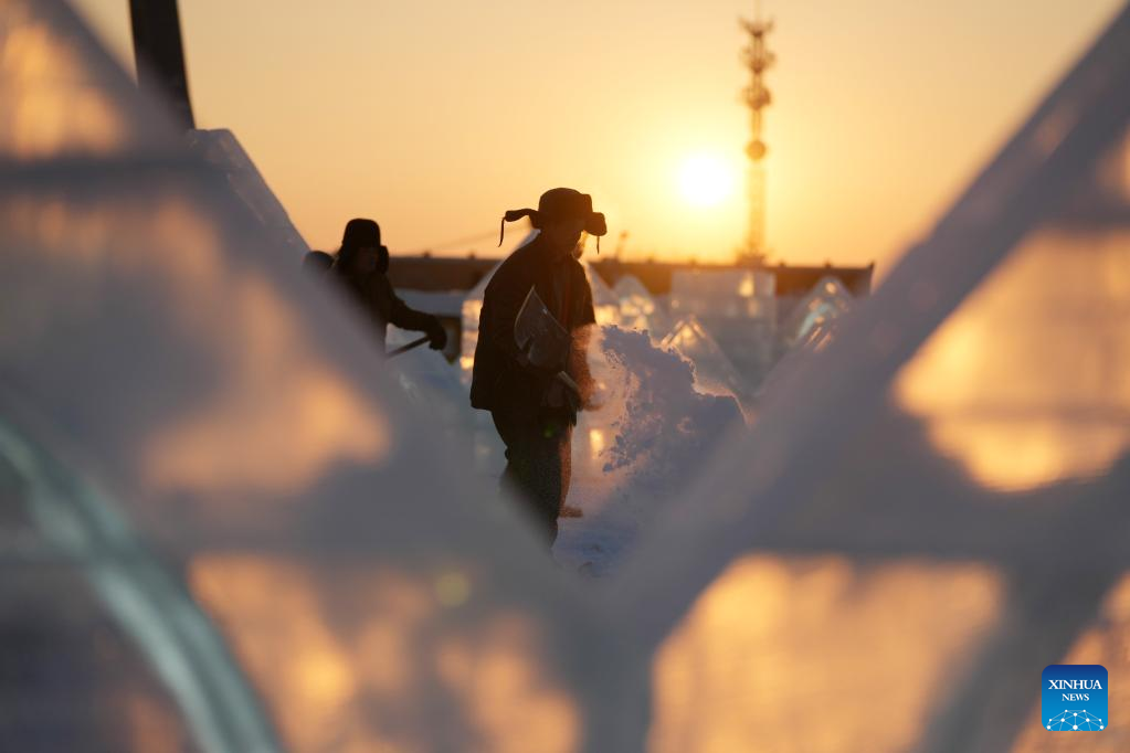 People work at the construction site of the Harbin Ice-Snow World in Harbin, northeast China's Heilongjiang Province, Dec. 23, 2021. The 23rd Harbin Ice-Snow World will open to the public on Saturday. (Xinhua/Wang Jianwei)