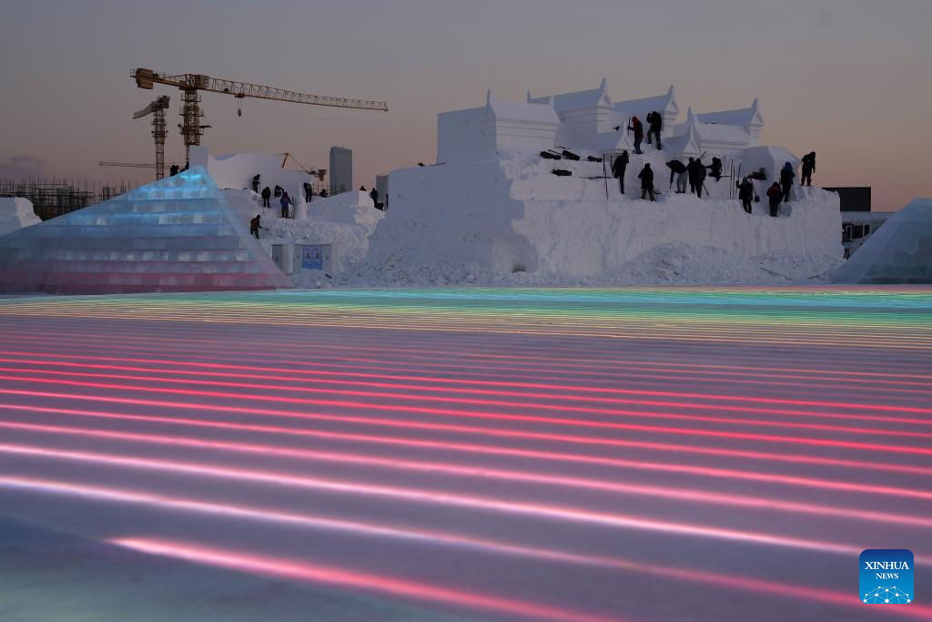 People work at the construction site of the Harbin Ice-Snow World in Harbin, northeast China's Heilongjiang Province, Dec. 23, 2021. The 23rd Harbin Ice-Snow World will open to the public on Saturday. (Xinhua/Wang Jianwei)