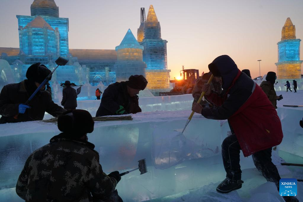 People work at the construction site of the Harbin Ice-Snow World in Harbin, northeast China's Heilongjiang Province, Dec. 23, 2021. The 23rd Harbin Ice-Snow World will open to the public on Saturday. (Xinhua/Wang Jianwei)
