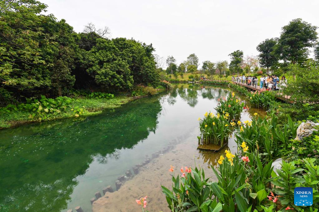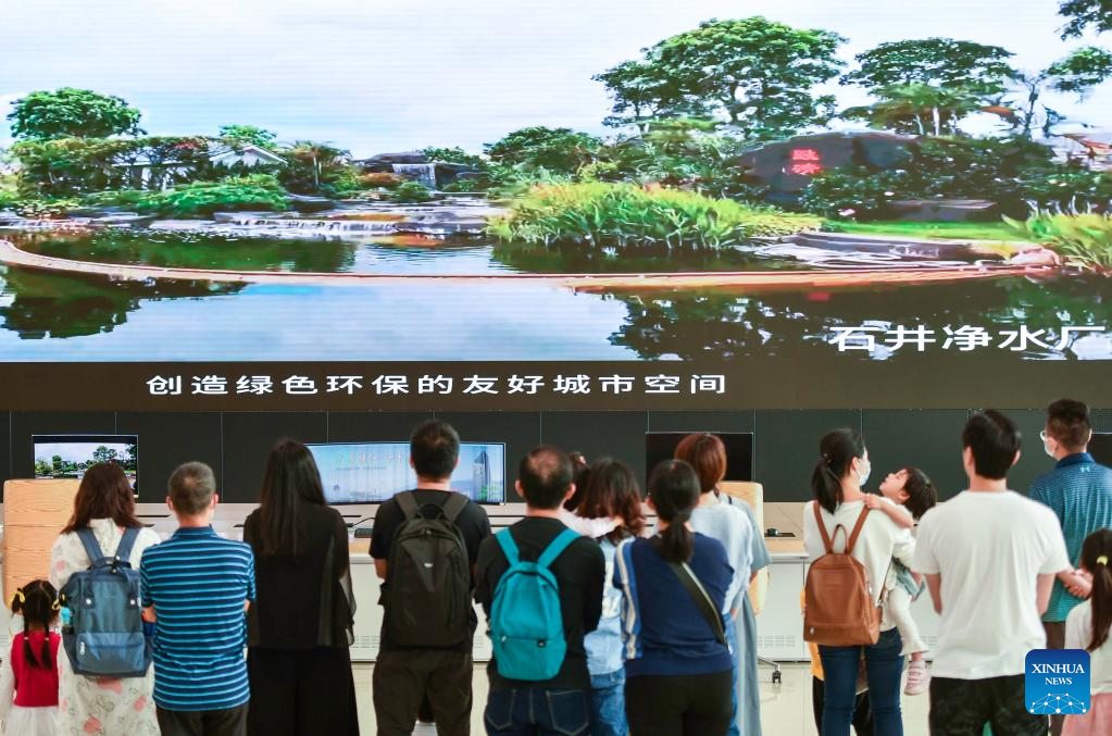 People visit Guangzhou Lijiao sewage treatment plant in Guangzhou, south China's Guangdong Province, Nov. 21, 2021. Traditional sewage treatment plants are being transformed into ecological underground sewage treatment plants in Guangzhou, to improve land utilization and tackle problems of secondary pollution.